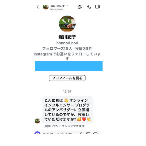 ご迷惑をおかけしております。インスタグラムのアカウントhonnori.noriからのDMで下記画像のようなものが送られてきますが、無視してください。